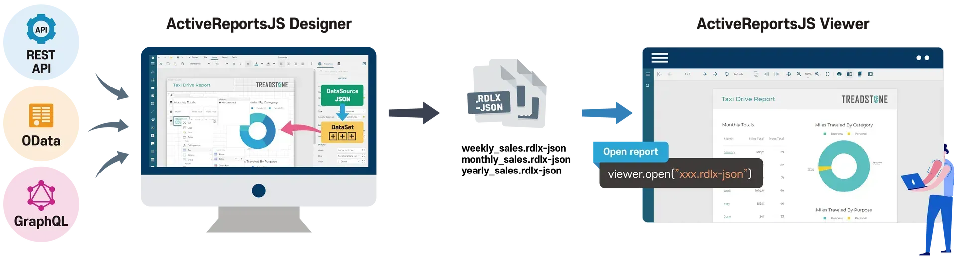 ActiveReportsJS Designer Supports data connections in JSON format, such as REST API, OData, and GraphQL, and allows you to quickly and easily create reports in the style you want with drag-and-drop, without coding.