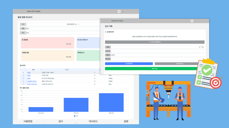 제조현장의 품질검사를 테블릿 하나로 간편하게 데이터를 입력하고 실시간으로 관리하는 통합 품질 관리 솔루션입니다.